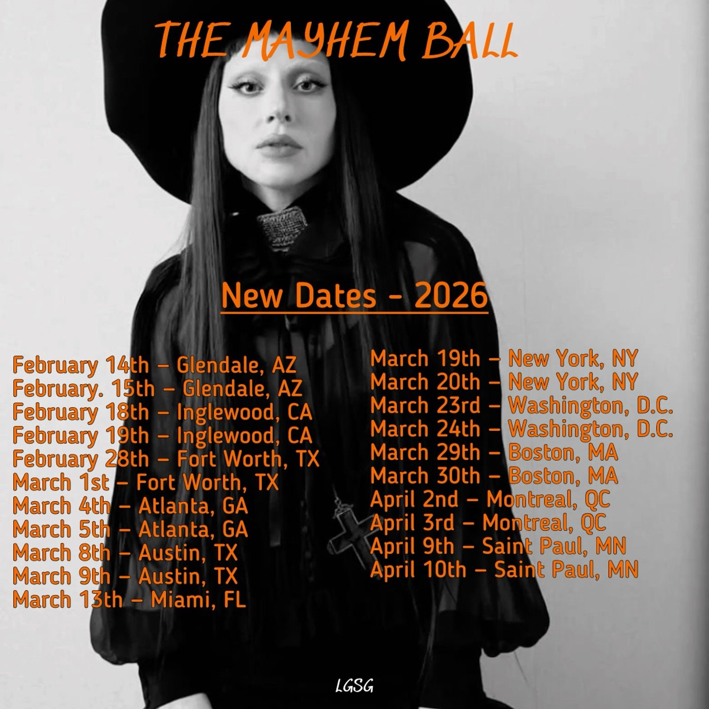 Get ready to see Lady Gaga live across North America! Below is the complete list of announced Mayhem Ball Tour dates and venues: